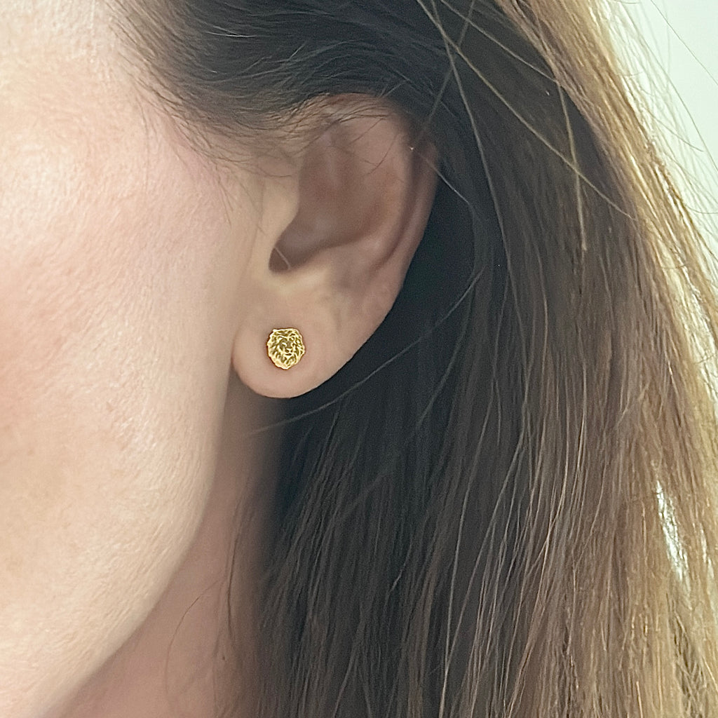 - Gold stainless steel post earrings, in the shape of a lion's head