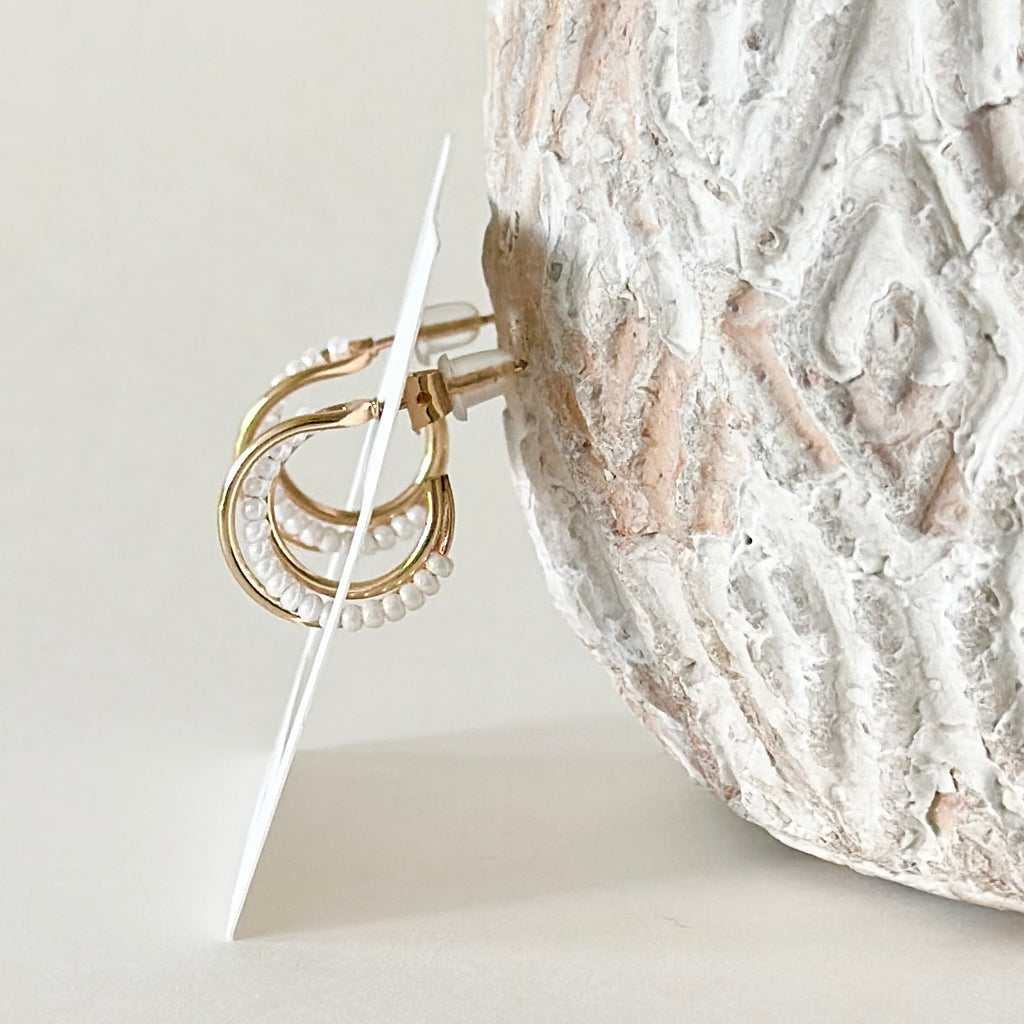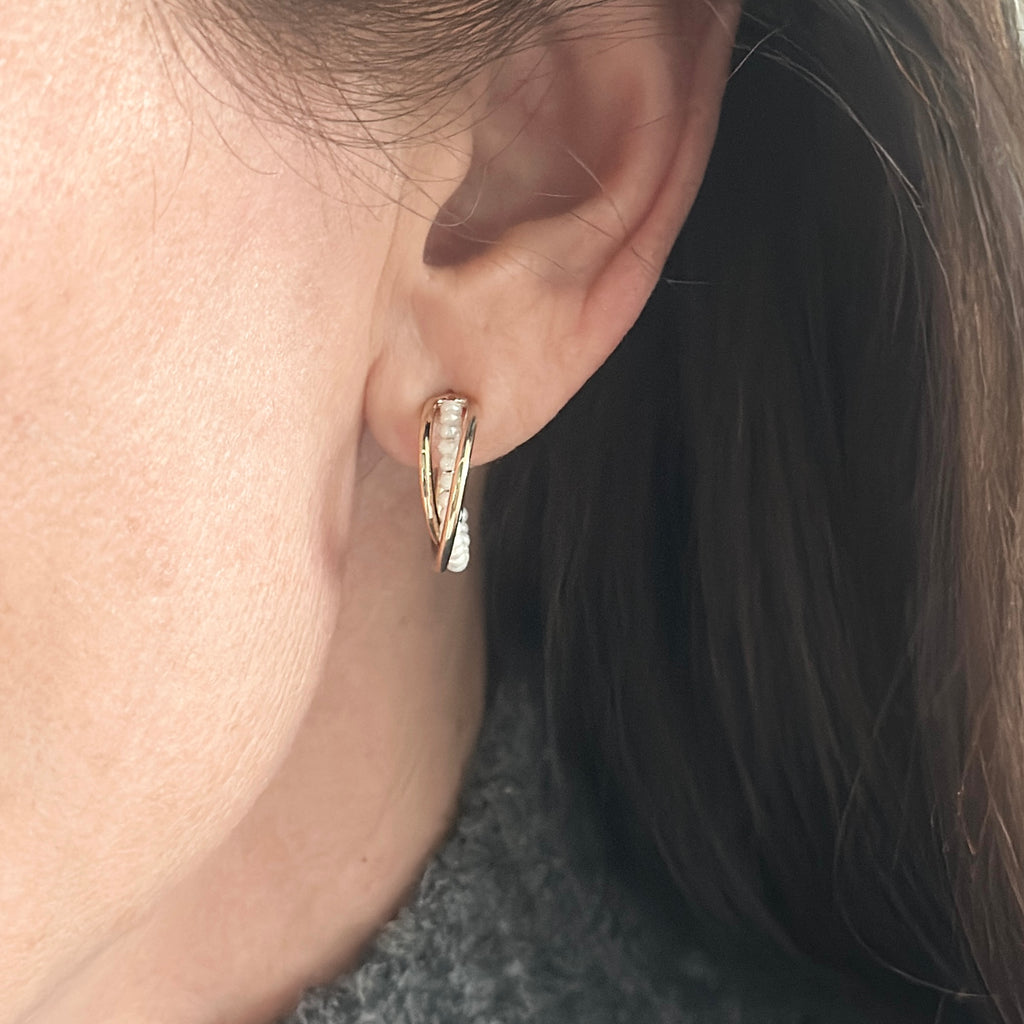 - Three delicate, intertwined hoops on one post: two are thin gold and the third is pearl